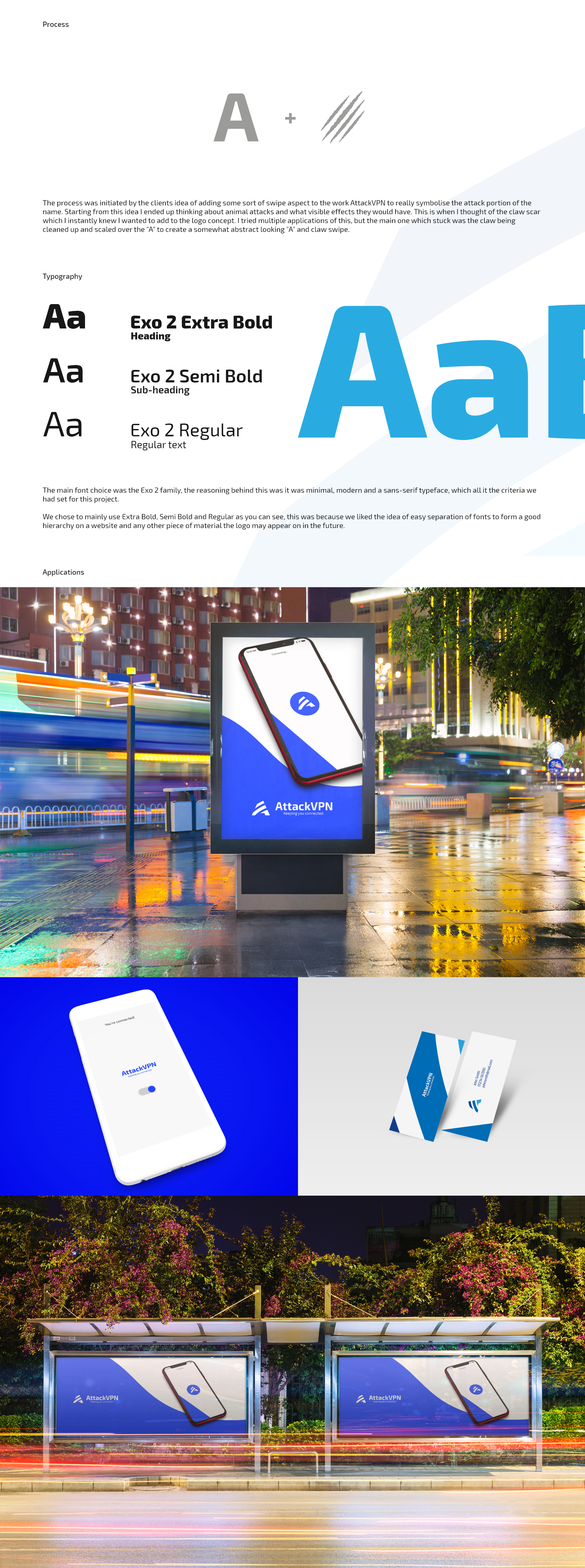 Client work for AttackVPN, including a Brand Identity and a UI/UX Package.